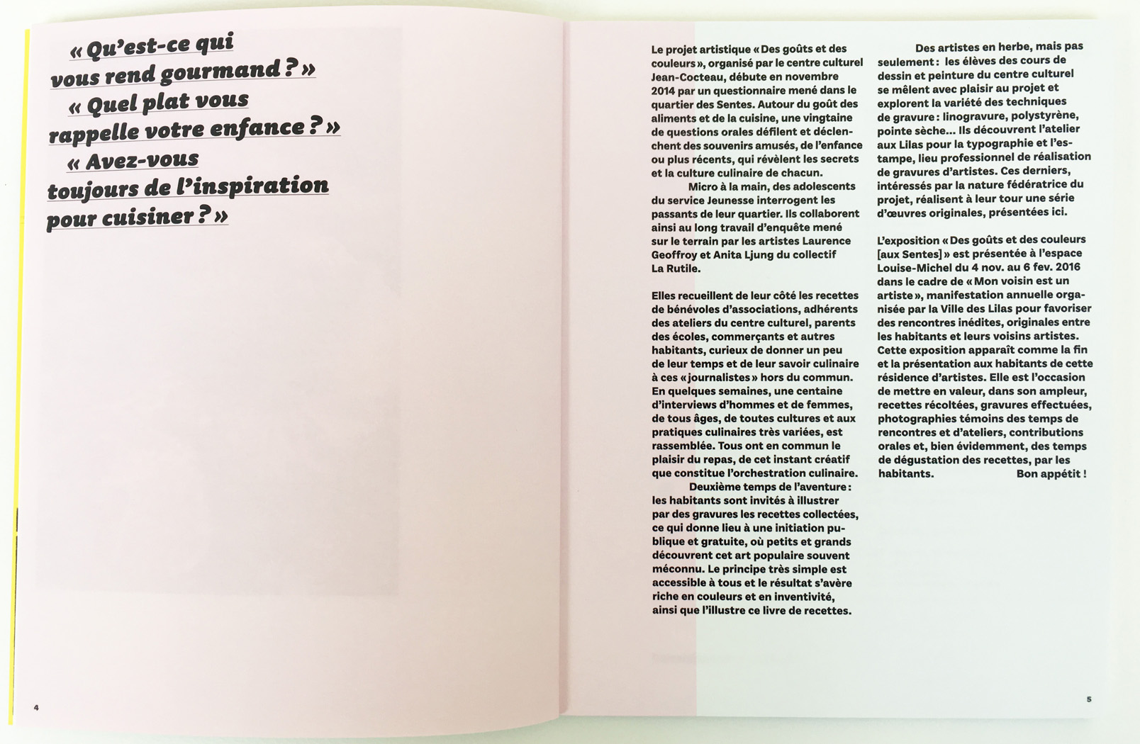 Livre de recettes illustré par des gravures, réalisé avec les habitants autour du centre culturel Louise Michel, Les Lilas.