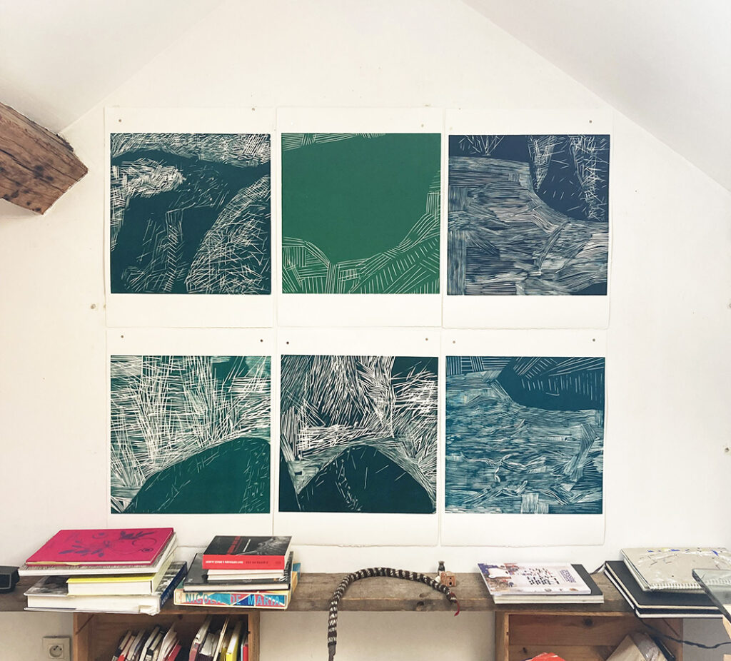 Rochers Exposition Artroom, Lisbonne, installation Vue d’atelier, composition avec 6 gravures sur bois, série Rochers Rochers 1M4Gravure sur bois, 48 X 48 cm