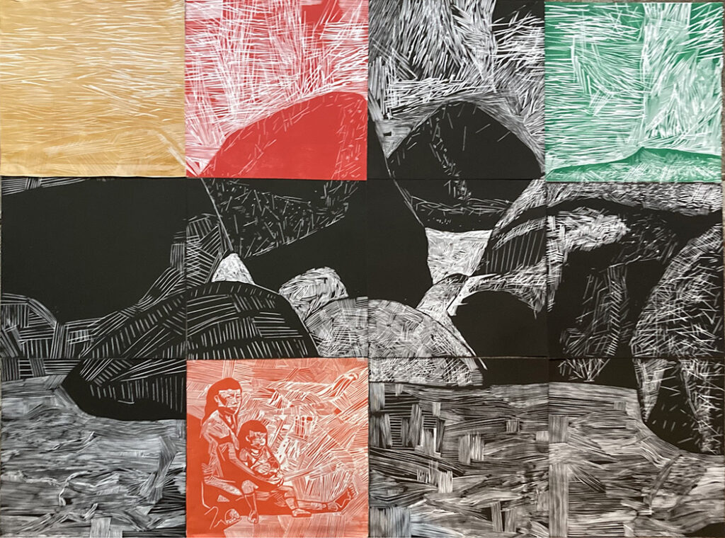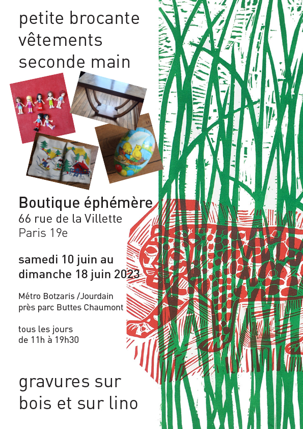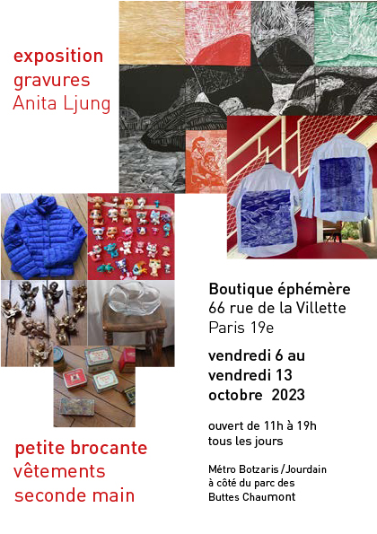 Matrices en bois et impressions sur papier se déploient et dialoguent pour cette exposition. Ce travail de gravure en taille d’épargne joue sur des modules : la juxtaposition, la rupture, la résonance entre les formes et les couleurs, la partition particulière créée pour chaque espace. Le choix de l’impression monochrome offre une expérience directe et sensuelle de la couleur et permet de ressentir l’énergie du travail avec la gouge.